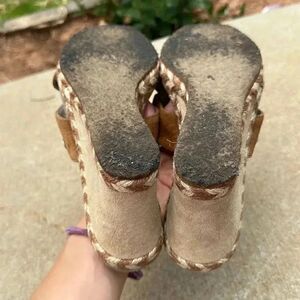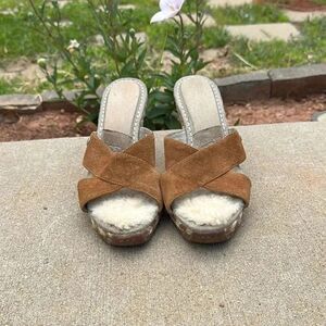 Margott 1689 style. Upper suede leather. Lining: textile, leather and genuine sheepswool. Outsole: crepe rubber. Suede leather crisscross straps with ugg chrome logo. Braided straw two toned trim. Please see photos for indications of use.