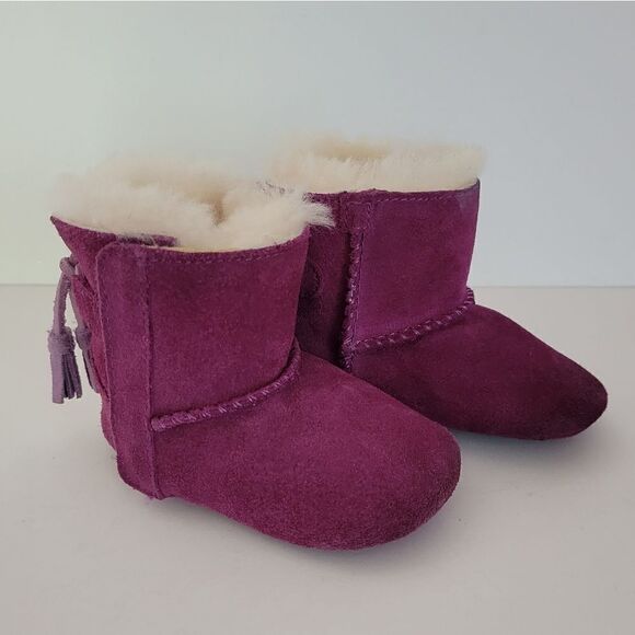 A cute, mocassin style bootie with all the softness of sheepskin lining, this UGG® bootie is made with a minimal suede silhouette perfect for both girls and boys as they grow. A hook-and-loop closure makes for easy on and off, while rubber tread helps with first steps. Plus, sheepskin is naturally heat regulating, so this bootie will warm little ones in cold weather and wick excess moisture in warmer conditions. This product contains real fur from sheep or lamb. It has been artificially dyed and treated.