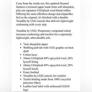 These boots are cozy from inside to out. They feature the signature UGG Plush wool blend within. The treadlite by UGG provides lightweight cushioning. Please see last two pictures for added details. New as seen by tags on bottom of boot in excellent condition!