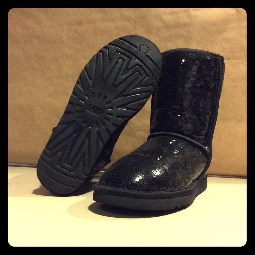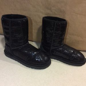 Black sequined UGG Australia Classic Short Sparkles mid-calf boots with round toes, tonal interior shearling lining, suede trim at counters featuring logo and glitter sequin