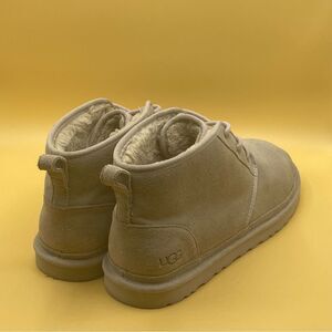 These UGG boots feature a soft suede material in a versatile tan color, perfect for various outfits. The ankle-high design includes a rounded toe and a low-profile silhouette, ensuring both style and comfort. With a simple lacing system and cushioned collar, these boots provide a secure fit and added comfort for all-day wear.