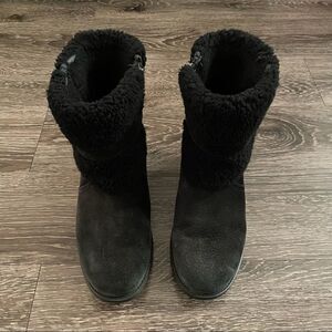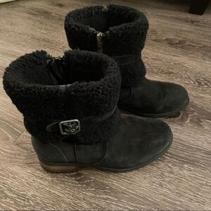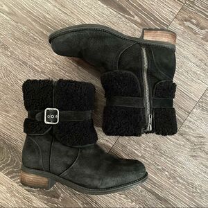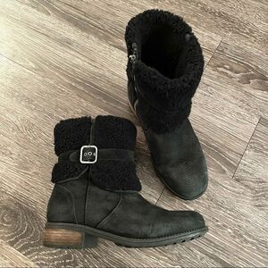 Ugg australia: blayre ii espresso suede boot. Polished styling meets rugged durability in the blayre ii. This essential boot boasts water-resistant silkee suede, a sumptuous sheepskin cuff, antiqued metal hardware, and a medial zipper for easy on and off. A luxurious, natural wool lining provides moisture-wicking warmth, while the 1 1⁄2" rubber heel ensures all day wearability with a ladylike lift. Collection details: insole: 3mm poron cushioning covered in 7mm curly uggpureTM. Outsole: molded rubber bottom with 1 1⁄2" stack leather wrapped heel. Style details: water resistant silkee suede upper and 7mm curly sheepskin cuff. Suede strap and metal buckle. Medial metal zipper. Heat embossed ugg® logo. 7 " shaft height. Color: brown