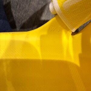A vibrant yellow shoe with a unique skeletal-like structure, featuring multiple curved ribs and ventilated openings.