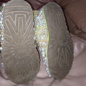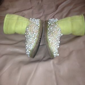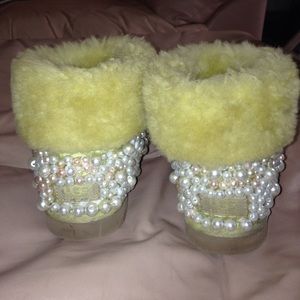 Pearl accented UGGS. YELLOW SUEDE & shearling fur. Some pearls have been replaced but none are missing. Trim needs minor cleaning. Rubber signature soles in good condition. Inside tag fell off. Beautiful boots & warm