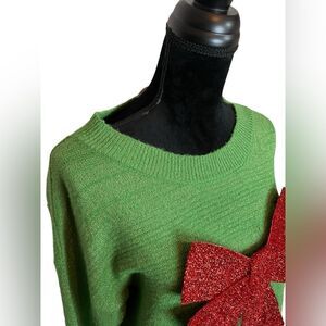 UGLY CHRISTMAS SWEATER SHIMMER/SPARKLE GREEN W/ RED GLITTER BOW WOMENS 2XL