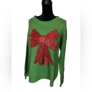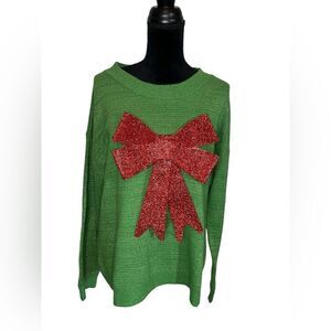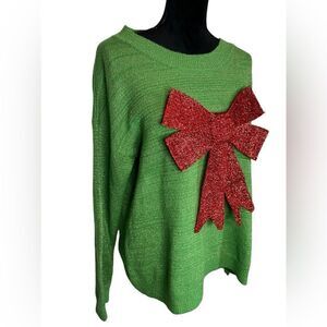 Keywords: Ugly Christmas Sweater, plus size, 2XL, green sweater, holiday sweater, Christmas party, winter fashion, women's pullover, 3D bow, metallic glitter, casual wear, festive clothing, long sleeve, crew neck, pre-owned sweater.