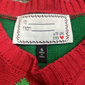Adorably Ugly Christmas Sweater featuring a snowed-in village with chimneys aglow, Happy Holidays border in gold sequins and lots of little Christmas bells to signal your arrival to any party this holiday season! This sweater is flared with a slight swing to replicate the shape of a tree skirt. Bottom trim is a fuzzy white furry border that looks like snow. Non-clingy poncho wrap silhouette ideal for an apple shape body. Unisex, 100% acrylic, size M. Above the size tag, a blank Merry Christmas label that you can personalize for the gift recipient… because this ugly sweater is too good to keep to yourself! A kitschy knit is the perfect Christmas gift that will make them giggle!