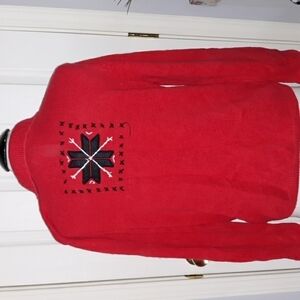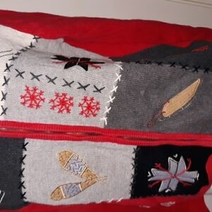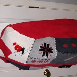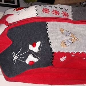 Vintage ugly Christmas cardigan sweater ~ zips up the front~ appliqued skier, skates, sled, etc on the front ~ emboidery trim ~ Size large