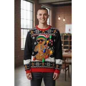 This UGLY Gingerbread Christmas Sweater in Men's size M is a black sweater adorned with 3D light bulb accents, making it perfect for office parties or casual holiday gatherings. The tight-knit fabric and long sleeves ensure warmth during the winter season. The gingerbread man and gingerbread theme adds a festive touch to the graphic print design, while the pullover style and crew neck neckline make it easy to wear for various occasions. This sweater is a fun and quirky addition to your holiday wardrobe, sure to bring a smile to anyone's face.
