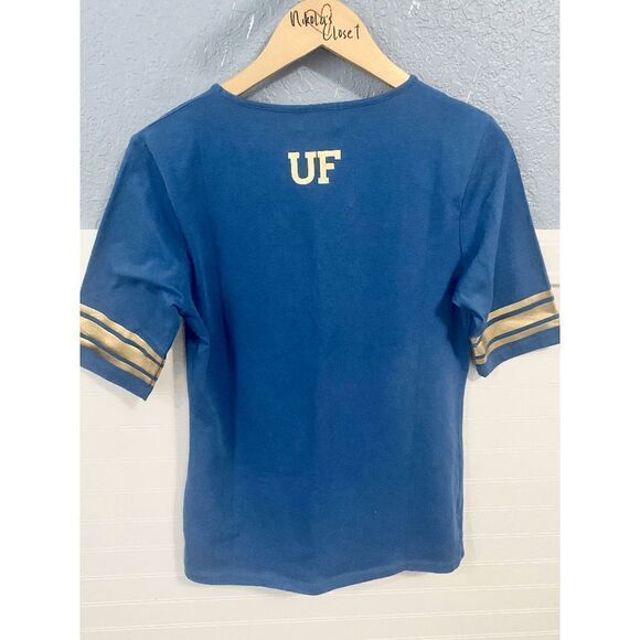 Discover your game day essential with UGalz's Florida Gators women's t-shirt. This pullover-style short-sleeved t-shirt is perfect for showing off your team pride! The soothing blue color is enhanced by a striking gold print of the Florida Gators logo on the front, ensuring you'll stand out in the crowd. Flaunting a flattering v-neck, it's finished with three fashionable gold stripes on each sleeve. Comfortable yet chic - this t-shirt is a must-have for any Florida Gators fan!