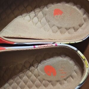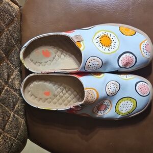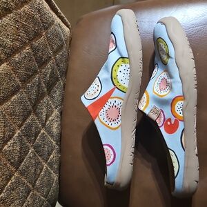 Here is a pair of UIN Toledo Juicy Kiwis Fruit Print Slip On Mules Flats Shoes Art To Wear Women's Size 9 Blue Green Pink Orange Red White. They are in good condition with the exception of a little wear and a few spots, but has lots of life left.