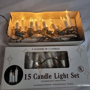 UL 15 Light White Triple Candle Christmas Light Set. Lot of 2 boxes. Easg string of lights has 15 lights which is 5 groupings of 3 candles with 13 inch spacing. Each grouping has a clip for ease to place where you want them. In great preowned condition. Please see all photos. There are extra bulbs and fuses in the boxes as well.