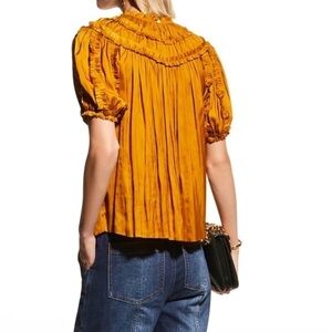 Ulla Johnson "Aimee" charmeuse blouse punctuated with a smocked bib and ruffle trim