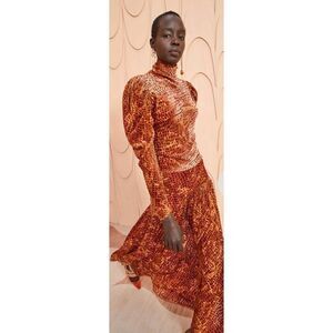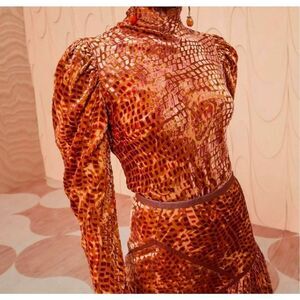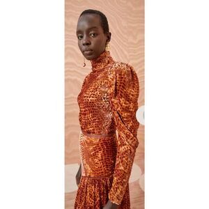 The Althea Turtleneck is crafted from our sumptuous velvet burnout fabrication featuring a swirling moir motif. Framed by our signature puff sleeves, this sienna brown top features an elegant high neck and fastens with a hidden center-back zipper.