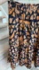 Preowned no flaws. Fastened via zip (and hook at top as pictured). Embellished with ruched detailing, ruffles and printed orange and peach pattern throughout the navy blue background.