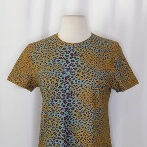 Rounded crew neckline ~ Short sleeves ~ Straight hemline ~ Fitted silhouette ~ Pullover styling ~ Soft unlined 100% cotton knit fabric ~ Leopard or ocelot print in various shades of orange-brown, reddish-brown & aqua blue