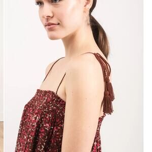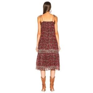 Ulla Johnson red printed midi dress with adjustable spaghetti straps and a tiered silhouette. Features lightweight cotton fabric, relaxed fit, smocked bodice, and side pockets for comfort and ease. Effortless and breezy this dress is perfect for summer, travel, or weekend wear. Flattering, flowy, and feminine.