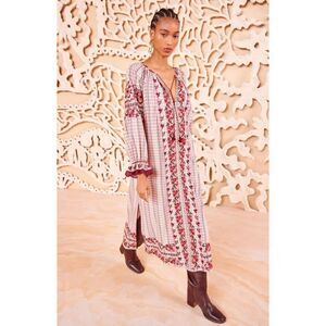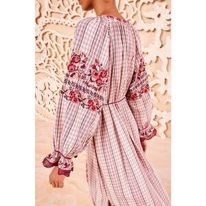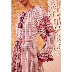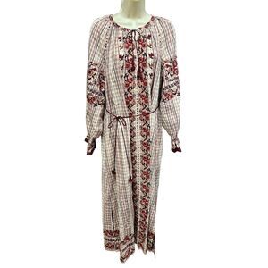 This Ulla Johnson Filia Dress is crafted from lightweight cotton shirting, adorned with a Madras plaid print, and embroidered with florals. This long-sleeve frock has a flowy silhouette with side slits, side pockets, and a removable belt for a cinched look. It also has tasseled neckties you can fasten or leave undone. The dress is maxi length.
