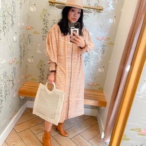 keywords: designer, luxury, striped, cotton, lightweight, breathable, spring, summer, fall, winter, midi, ruffle, poplin, structured, feminine, vacation