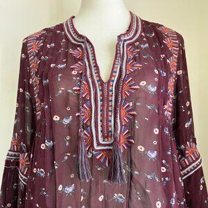 Gorgeous designer silk dress featuring long sleeves, elastic smocked waist, tassel accents, embroidery stitching detail, pleated and lined ruffle skirt. Lining is polyester. Retailed for $595 and a celeb favorite worn by Camila McConaughey and Mila Kunis ( see pics).