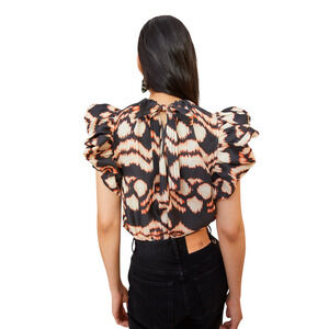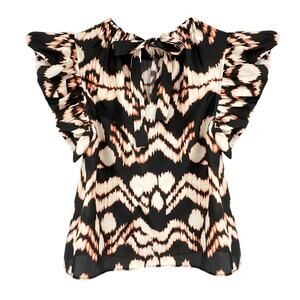 A standout print from the Autumn/Winter ’23 collection, the Iren Top is saturated in a painted ikat motif with cream graphics against a black backdrop. It is framed by voluminous flutter sleeves, has a loose silhouette, & a tie-fastening keyhole at the back.