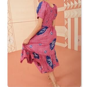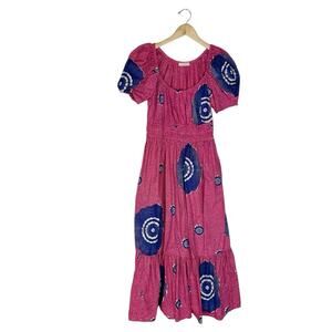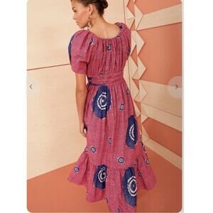 Make a vibrant statement in this Ulla Johnson midi dress, featuring a rich pink base with bold indigo circular print accents. Designed with puff sleeves, a gathered scoop neckline, and a flattering smocked waist, this dress blends feminine structure with artistic flair. The soft, breathable cotton fabric and flowing tiered skirt make it ideal for warm-weather wear, resort escapes, and effortless daytime style. A standout piece that embodies Ulla Johnson’s signature bohemian elegance and eye for print.