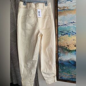 Beige pants with pockets on the front and back and belt of the same fabric, new with tags in perfect condition