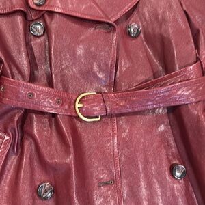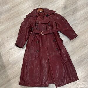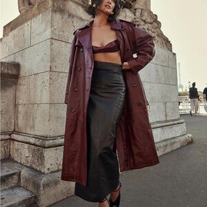 This is an absolutely gorgeous leather coat by Ulla Johnson. Elevate your style with this chic burgundy trench coat. Featuring a classic double-breasted design and puff sleeves, it's perfect for any occasion.