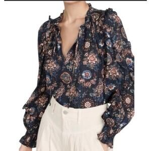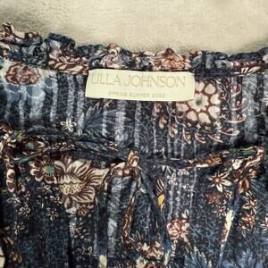 ULLA JOHNSON Manet Ruffled Floral Print Cotton Voile Blouse Size 8 Blue Brown