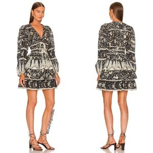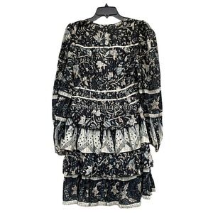 The Nina Dress is made from an array of printed artworks that are entwined together on layers of lightweight cotton. This mini dress is a signature Ulla Johnson shape, designed with full sleeves, plunging neckline, and nipped-in waist. It's finished with a tiered ruffle skirt and a side-seam zipper. 70% Cotton, 30% Viscose. Approx. 18" pit to pit and 36" in length.