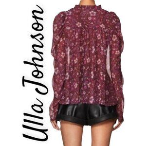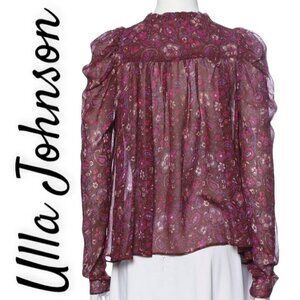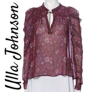 ULLA JOHNSON Renly 100% Silk Chiffon Sheer Floral Paisley Puffed Sleeve Blouse in Claret, Size 0