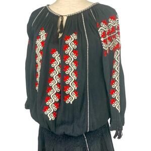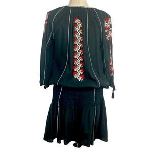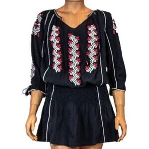 Ulla Johnson mini dress with cropped sleeves, slit neckline, tassel accents, elastic knit at waistband for fit and embroidered detailing throughout.