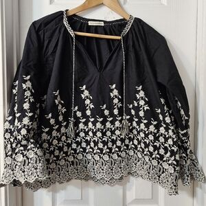 ULLA JOHNSON Sonya Blouse Black Boho Tassel Embroidered Ruffled Poplin Top