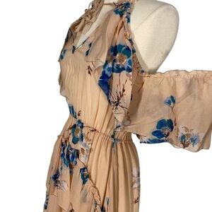 FEATURES: light pink with blue watercolor floral print, ties at neck, halter neck, 100% silk, lined, tiered bodice, trailing hem. Pre-owned, excellent condition.