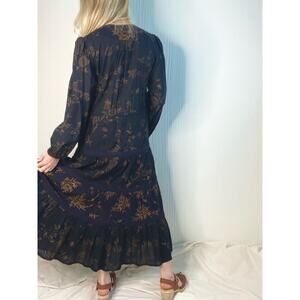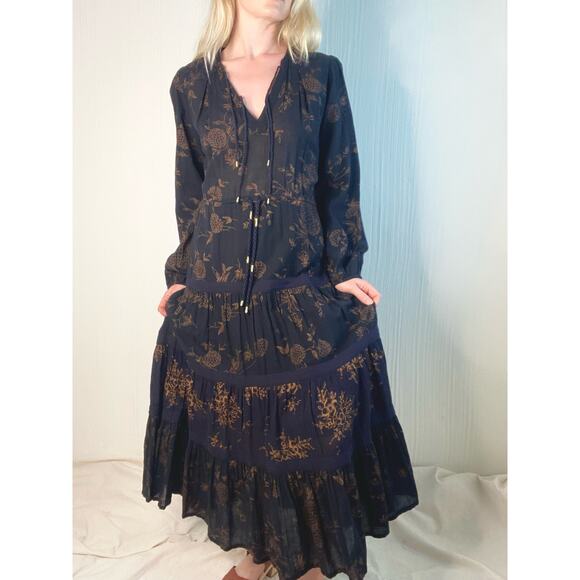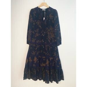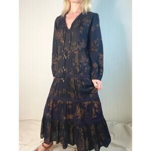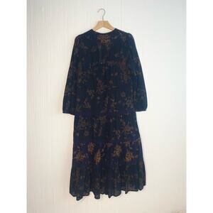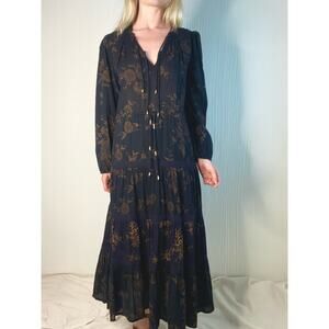 Ulla Johnson black and gold floral cotton gauze Varanasi midi-dress styled with self-patches and a gathered tiered skirt. Relaxed silhouette, split neck with braided ties, cased drawstring waist, cased elastic cuffs. Ties at waist. Lined at skirt