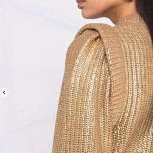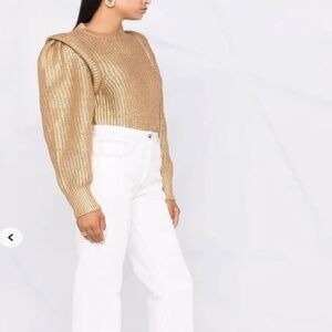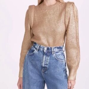 Golden brown cashmere-wool blend Victoire metallic-thread sweater from ULLA JOHNSON featuring metallic sheen, crew neck, long puff sleeves and straight hem.