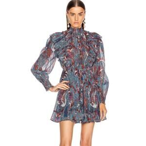 Features red and blue glitter bird pattern all over, long sleeves, ruffle accents, mini length, lined skirt. Ulla Johnson's Vienne crepe chiffon mini dress in this season's runway-featured birds of paradise print. High smocked neck. Long sleeves with smocked cuffs. Fitted waist. Partially lined skirt. In red/blue.