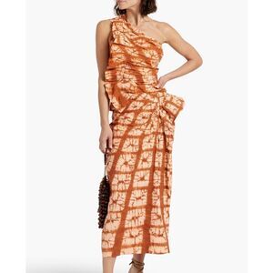 ulla johnson, veronica beard, tie dye, ruffle accent, one shoulder, boho, coastal, beach, vacation, resort, tropical, handmade, casual, pop of color, business casual, spring, summer, lightweight, breathable, zip closure, full length