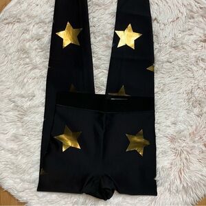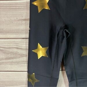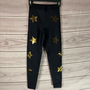 In excellent used condition no rips, tears or stains. With a luxurious performance fabric, and a sleek gold-on-black design, the Ultracor Lux Knockout Print Legging in Nero/Iridescent Gold boasts a blend of style and performance that you can wear anywhere. Built-in shapewear lifts your butt, flattens your tummy, and engages your core, ensuring you look your best simply by putting on these stylish leggings. Featuring shiny black stars bonded to a black background, this ankle length legging boasts chic style that looks as good on the street as it does in the gym.
