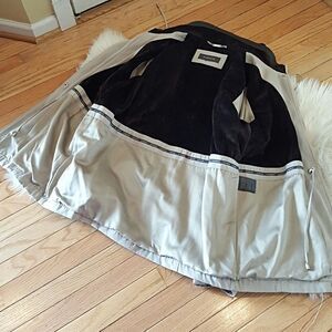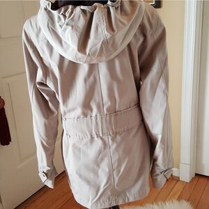 This is the ultimate in winter anoraks!!! Lined in soft faux fur, including the hood, leather trim for a stylish touch on zip pockets & hood. Can be worn belted or not. Zipper closure along w/ snaps to keep out the cold. Wind breaker sleeves measure 24". Length is 29.5" Never worn. Size L.