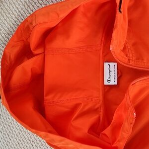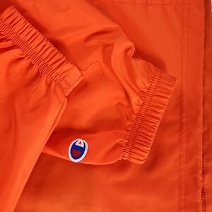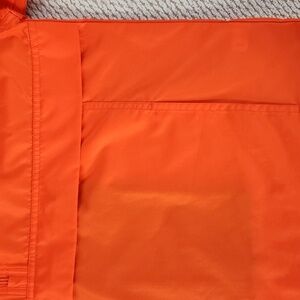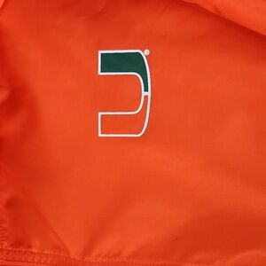 Bright orange windbreaker jacket featuring a logo for University of Miami on the chest. Perfect for casual wear. Pullover with draw string around neck and bottom of jacket. side pockets and zipper pocket hidden under center flap. like new!