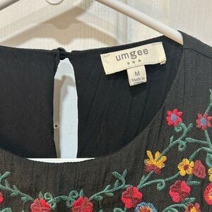 This UMGEE tunic dress is a beautiful and unique addition to any wardrobe. The black gauzy fabric is adorned with intricate embroidered accents, adding a touch of bohemian and hippie style. It features a shift silhouette and short length, making it perfect for any occasion. The dress is a size M, ideal for regular sized women. The gothic vibes of this dress are sure to turn heads, while the floral and peasant themes add a whimsical touch. Get ready to feel confident and stylish in this stunning piece.