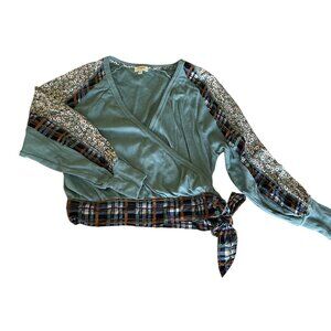 The UMGEE DENIM Surplice Printed Tie Waist Shirt in size small features a unique multi print design with a crossbody style. Made from algodon material, this blouse has long sleeves and a V-neckline with a tie closure. The green color adds a pop of color to your wardrobe, while the bow accents give it a trendy touch. Perfect for the winter, fall, or spring seasons, this shirt offers a regular fit for a comfortable and stylish look.