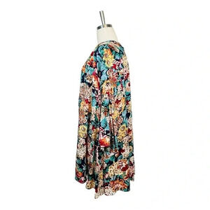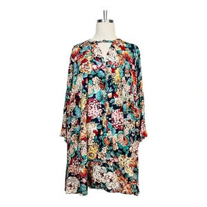 Umgee Multicolor Floral Boho Trapeze Swing Peasant Dress, bell sleeves, V-neck with a front button closure, keyhole detail, hippie tunic, oversized, women's size medium.