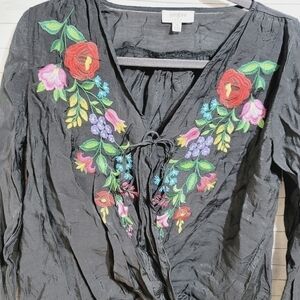 UMGEE GAUZY FLORAL EMBROIDERED DETAIL LONG SLEEVE BLOUSE FAUX WRAP MIDRIFF SZ SM