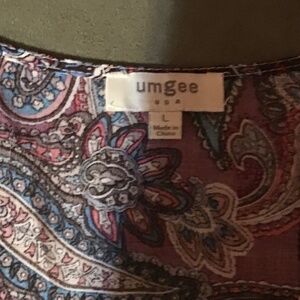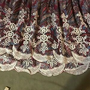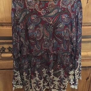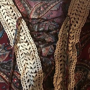 Super cute! NWOT Sculpted with lace and embroidery. Bell sleeves, V neck with lace ties. Burgundy with blue paisley print that works with the off white trim. Very cute top. The outside sleeves measure 27”. The pit sleeve length is 17”. Pit to pit is 20”. The back is a little longer than the front, measuring 28” and the front 26”. Please see pictures for measurements. This top is screaming for bell bottoms or skinny’s with tall boots. Too small for me so I am about to order another one because it is so precious!