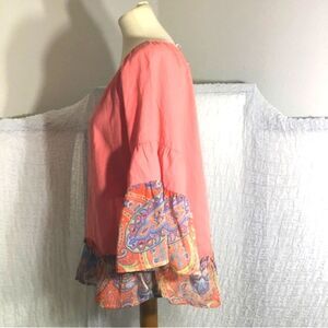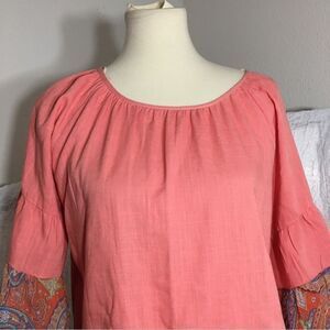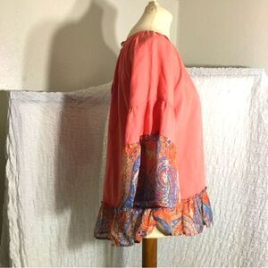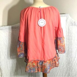 Coral peasant top with flared sleeves. Colorful Pasley ruffled accent. It's new with tags. Please refer to pictures for best description and condition verification.
