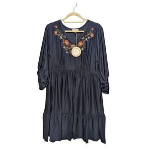 UMGEE Navy Floral Embroidered V-Neck Tiered Ruffle Boho Babydoll Dress Size S