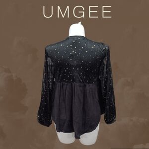 UMGEE Peasant Blouse Ballon Sheer Sleeve Plunge Neck Casual Top Gold Accent Sz M
