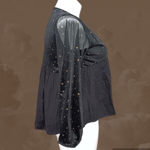 The blouse is a size M, but material tag states size small. Has a unique design with stars pattern on the sheer sleeves, making it a standout piece. This top is perfect for summer, fall, or spring, and it's suitable for women who want to have a hippie or bohemian-themed fashion. This product is listed under Women's Clothing, Tops and is a new item with tags. Please see photos for details. 40 inch chest. 24 in sleeve length, and 23 inch front length of top and 28 inches long in the back.